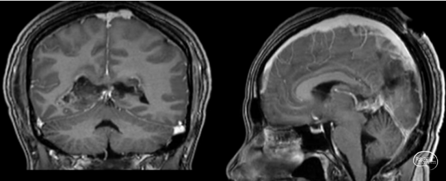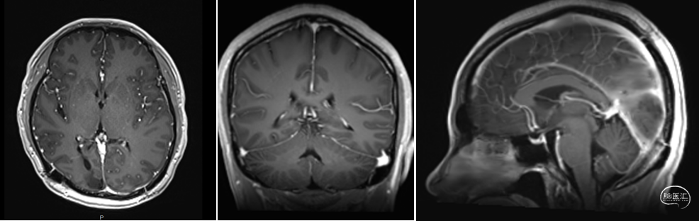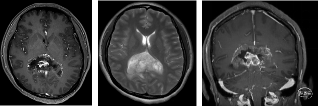 临床症状进行性加重,短期内出现头痛症状,影像学提示胼胝体压部占位,肿瘤紧邻三脑室顶后部、中脑顶盖、中脑导水管、四叠体池/脑深部引流静脉受压明显,占位效应重。
