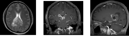 bGBM最常见的部位是额叶(64.1%)和顶叶(15.4%)。bGBM侵袭胼胝体最常见的部位是在膝部(48.7%)和压部(28.2%)。bGBM最常见的症状包括头痛、认知能力下降,包括意识混乱和记忆丧失,以及癫痫发作。后期可出现神经功能缺损及颅内高压症的表现。影像学诊断基本同胶质瘤,特征即肿瘤存在于胼胝体两侧,突入脑室及脑实质内[2]。