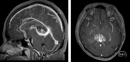 手术风险评估:肿瘤位于脑中央深部,毗邻重要功能结构,与大脑内静脉、大脑大静脉、脉络膜后内侧动脉、中脑顶盖关系密切,肿瘤血管丰富,可能来源于脉络膜动脉及其分支。