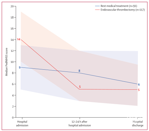 图3. 入院和出院时PedNIHSS评分的中位数。PedNIHSS评分范围从0到42,分数越高表示神经缺损程度越大。阴影区域表示四分位数间距(IQR)。