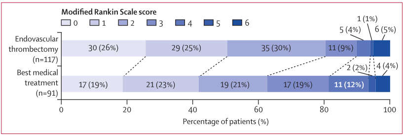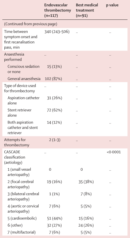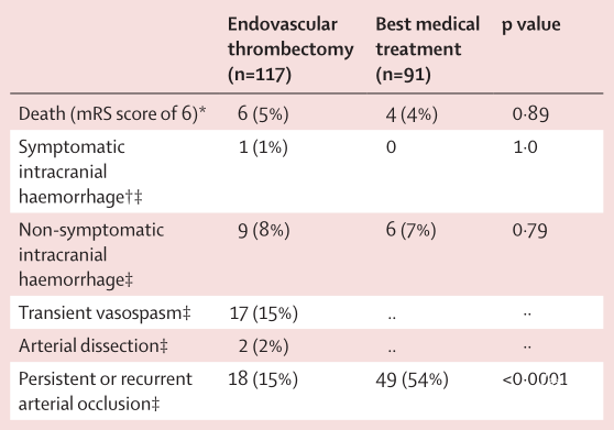 安全性结果见表3。血管内取栓组117名患者中6名(5%)和最佳药物治疗组91名患者中4名(5%)在90天时的mRS评分为6,代表死亡(p=0.89)。血管内取栓组中有17名(15%)患者在干预过程中出现了暂时性血管痉挛,所有病例均自发消退或在接受动脉内尼莫地平后消退。2名(2%)患者发生了导管相关的非血流受限动脉夹层。治疗过程中,血管内取栓组的117名患者中有9名(8%)和最佳药物治疗组的91名患者中有6名(7%)发生无症状性颅内出血(p=0.79)。出现1例症状性颅内出血,发生在血管内取栓组。此外,血管内取栓组的持续性动脉闭塞发生率显著低于最佳药物治疗组(18 [15%] vs 49 [54%] ,p<0.0001;表3)。对持续性闭塞患者的进一步CASCADE分类显示血管内取栓组中18人中的8人(44%)和最佳药物治疗组49人中的19人(39%)怀疑为局灶性脑动脉病病因。