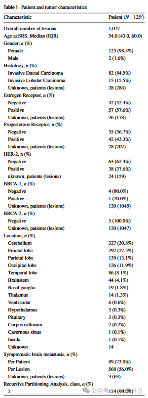 这项回顾性队列研究纳入了2007年至2022年间在我院接受SRS治疗的乳腺癌脑转移患者。我们排除了接受多次SRS的患者,SRS治疗后没有至少一次随访MRI或临床评估的患者,以及那些没有高质量MRI扫描(包括T1、T2和FLAIR序列)需要进行肿瘤体积分析或准确的脑白质病分级的患者。最终,共有125名患者1077个脑转移参与了这项研究。