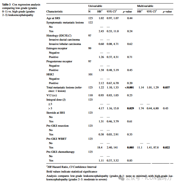 分析脑白质病发展的危险因素揭示了重要的见解。在单变量分析中,转移性肿瘤的数量与高级别白质脑病的风险增加显著相关(HR: 1.22, 95% CI: 1.10-1.35, p < 0.001)。此外,累计总剂量超过3J表明预后较差(相对危险度:4.17,95% CI: 1.16-15.0, p = 0.029)。然而,最引人注目的发现是SRS治疗前WBRT的影响,它在单变量分析(HR: 18.4, 95% CI: 2.40-141, p = 0.005)和多变量分析(HR: 1.14, 95% CI: 1.01-1.29, p = 0.037)中都是高度脑白质病的有力预测因子。Trifiletti等证明,治疗病灶的总数目(HR: 1.084, P= 0.003)、SRS照射颅脑的累积积分剂量(HR: 1.273, P= 0.036)和SRS治疗前的WBRT (HR: 2.564, P= 0.019)与照射后脑白质病的可能性增加相关。同样,Cohen-Inbar 等人证明,颅脑受照积分剂量大于3 J (HR: 3.28, = 0.012)和SRS治疗前WBRT (HR: 2.825, P= 0.042)会增加脑白质病的风险,而治疗病灶总数目并未显著增加脑白质病的风险(HR: 1.030, P= 0.663)。Liu等发现,年龄大于77岁(HR: 2.971, P < 0.001)、病变大于28 cm3 (HR: 6.271, P < 0.001)、WBRT和SRS联合(HR: 11.97, P < 0.001)与脑白质病发生的可能性较大相关。相比之下,他们的研究结果表明,先前的化疗(HR: 1.397, P = 0.166)和治疗病变的多样性(HR: 1.172, P = 0.303)与统计学上较高的脑白质病发生无关。值得注意的是,在我们的队列中,先前研究中涉及的几个因素显示与脑白质病的结果没有显著关联。这些指标包括年龄、症状性转移灶表现、组织学、受体状态、SRS治疗的12 Gy体积(V12)、SRS治疗时的类固醇使用、SRS治疗前切除术和SRS治疗前化疗。例如,Ebi等发现年龄较大是一个重要的危险因素,Conill等发现先前存在的马屁白质病变是脑白质病进一步发展的预后因素。]这种差异可能是由于患者群体或治疗方案的差异,需要在未来的研究中进一步调查。