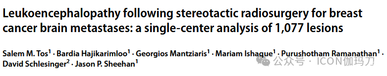 《Acta Neurochirurgica (Wien)》杂志. 2025年3月14日在线发表美国University of Virginia的Salem M Tos , Bardia Hajikarimloo , Georgios Mantziaris, 等撰写的《立体定向放射外科治疗乳腺癌脑转移瘤后的脑白质病变:1077例病灶的单中心分析Leukoencephalopathy following stereotactic radiosurgery for breast cancer brain metastases: a single-center analysis of 1,077 lesions》(doi: 10.1007/s00701-025-06478-8.)。