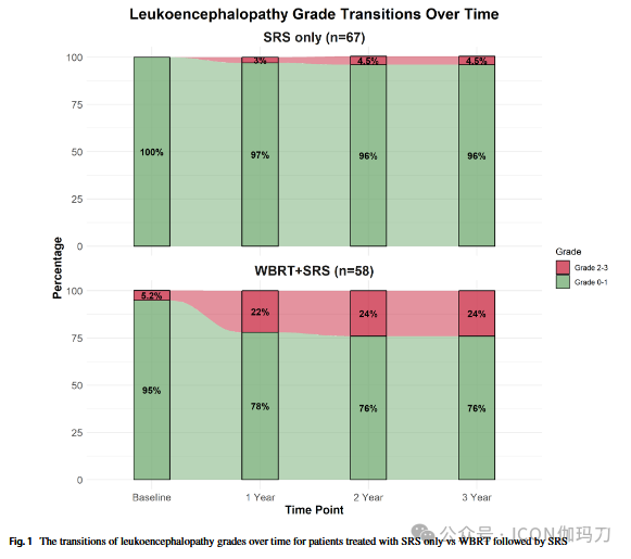 在我们的队列中,脑白质病的发病率在治疗组之间有明显的区别。基线时,仅SRS组无或低级别白质脑病的患者比例为100%,WBRT + SRS组为95% (p = 0.10)。1年时,仅SRS治疗组无或低度脑白质病患者比例降至97%,WBRT + SRS组降至78%,差异有统计学意义(p < 0.001)。到2年和3年,单纯SRS治疗组无或低级别白质脑病的患者比例仍为96%,WBRT + SRS组的下降至76%。两组间在两个时间点的差异均有统计学意义(p = 0.001)。这些发现与之前的研究一致,如Monaco等对肺癌个体的研究,该研究报告了接受WBRT + SRS的个体白质脑病发生率(97.3%)明显高于单独接受SRS的个体(3.2%)。我们的研究结果也与Trifiletti等的研究相似,该研究报告了多次SRS治疗的患者在第1、2和3年的脑白质病发生率分别为29%、38%和53%。在Liu等的另一项研究中,他们报道了993例脑转移瘤患者的队列,其中包括291例WBRT + SRS和702例单独的SRS治疗,脑白质病的总发病率为20.1% 。他们还显示,在随访1年(19% vs. 2.6%)、2年(45.9% vs. 5.3%)、3年(67.5% vs. 7.8%)和5年(85% vs. 14.7%)的患者中,接受WBRT + SRS治疗的脑白质病发病率显著高于单独接受SRS治疗的患者的(P < 0.001)。Cohen-Inbar等在对92例脑转移瘤患者的研究中发现,在随访1年(P = 0.0002)和2年(P = 0.0345)时,WBRT + SRS组脑白质病的发生率高于单纯SRS组[0]。与我们的研究类似,Choi等发现,在63例伴有黑色素瘤脑转移患者中,WBRT + SRS组2级或3级脑白质病的发生率明显高于SRS组的(71.4% vs. 12.2%, P < 0.0001)。我们观察到脑白质病的患病率随着时间的推移而增加,在WBRT后的第3年,18.8%的SRS治疗患者进展为2级或3级脑白质病(相比之下,SRS组只有4.5%),这强调了在治疗决策中延长随访和考虑长期生活质量的必要性。
