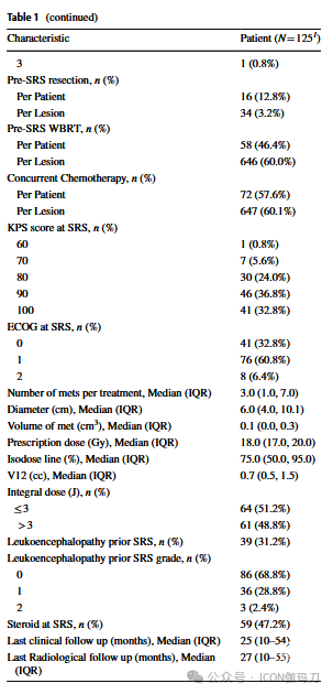 处方中位剂量为18.0 Gy (IQR: 17.0 ~ 20.0),中位等剂量线为75.0% (IQR: 50.0 ~ 95.0)。每次放射外科治疗的转移瘤中位数目为3.0个(IQR: 1.0-7.0)。在SRS治疗之前,12.8%的患者接受了至少一个病变的手术切除,46.4%的患者接受了WBRT。57.6%的患者同时接受化疗。在进行SRS时,47.2%的人服用类固醇。