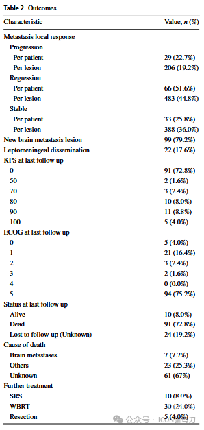 66例患者(51.6%)、483个病灶(44.8%)出现肿瘤消退,33例患者(25.8%)、388个病灶(36.0%)出现肿瘤稳定(表2)。29例患者(22.7%)、206个病灶(19.2%)出现肿瘤进展。随访期间99例(79.2%)患者出现新的脑转移瘤,22例(17.6%)患者出现脑脊膜播散。总死亡率为72.8%。部分患者需要进一步治疗,包括10例(8.0%)接受重复SRS, 30例(24.0%)SRS治疗后接受WBRT, 5例(4.0%)接受切除。