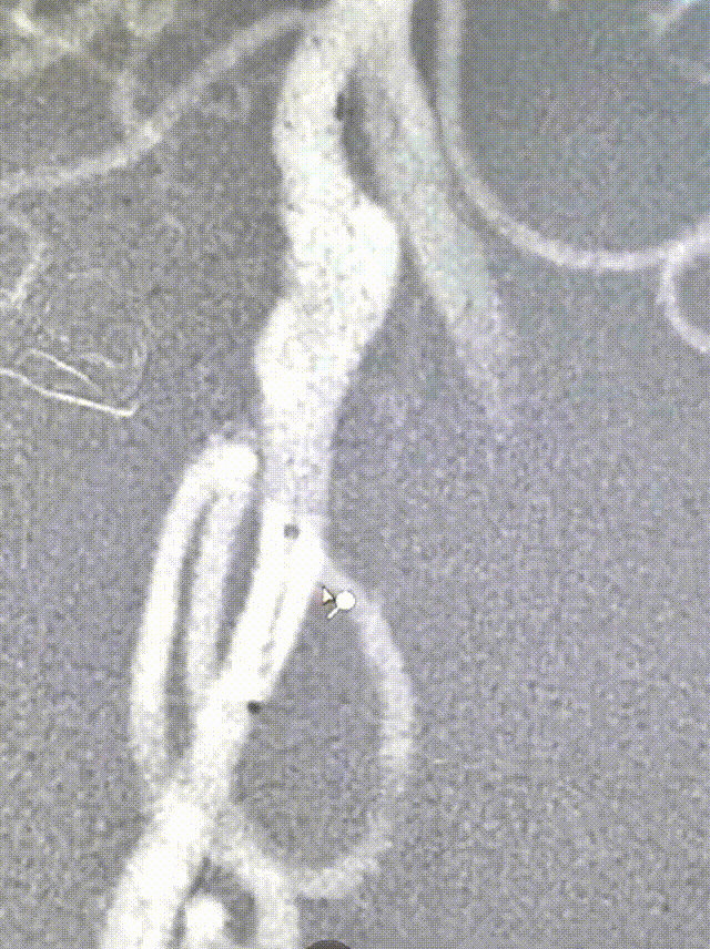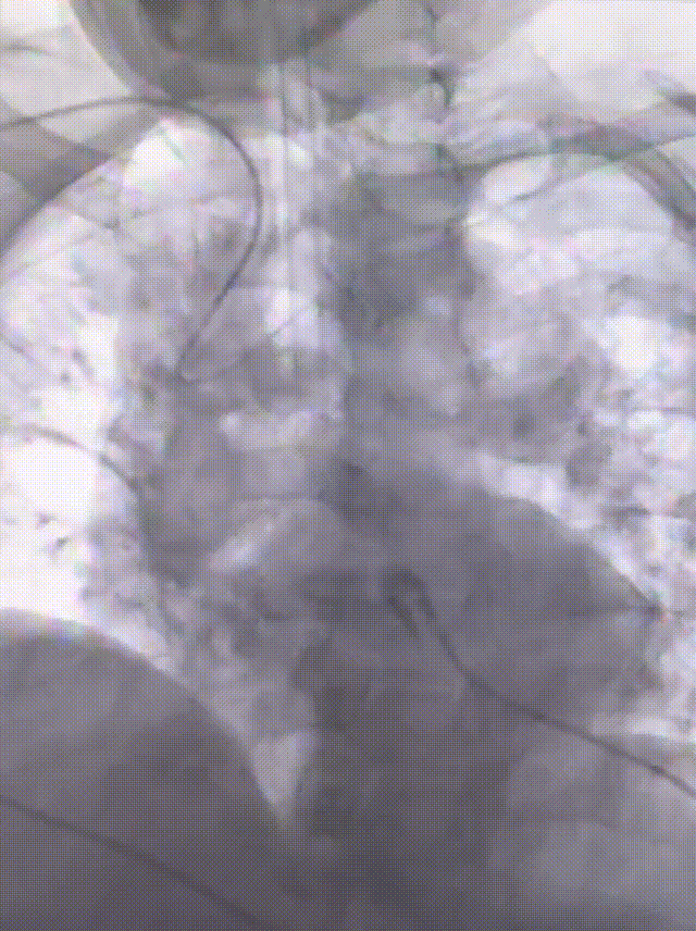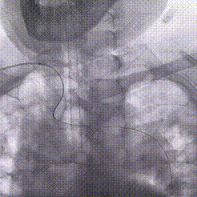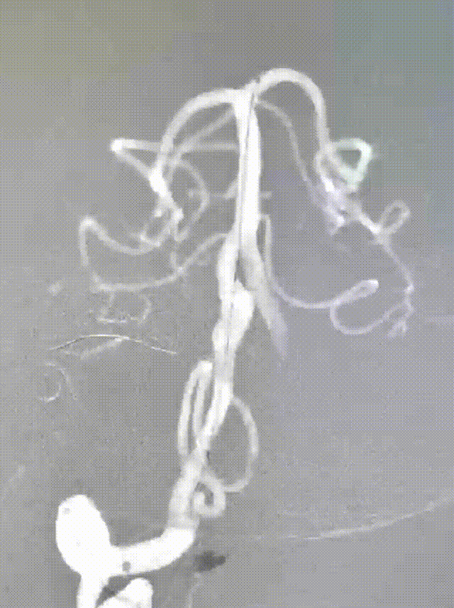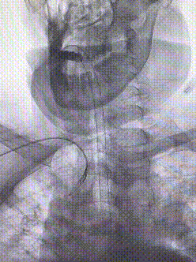 将EasyRadial™输送导管撤至近端V2段动脉瘤处,释放7.0*40mm 血管支架。