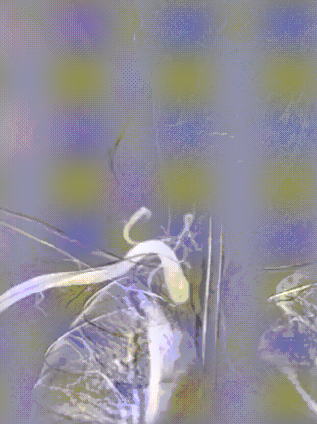 经桡动脉穿刺,132cm Simmons导管带7F 105 EasyRadial™输送导管过弓成攀超选右侧椎动脉。