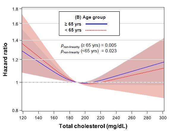 图1. 胆固醇与不同脑卒中亚型死亡率之间的关系。