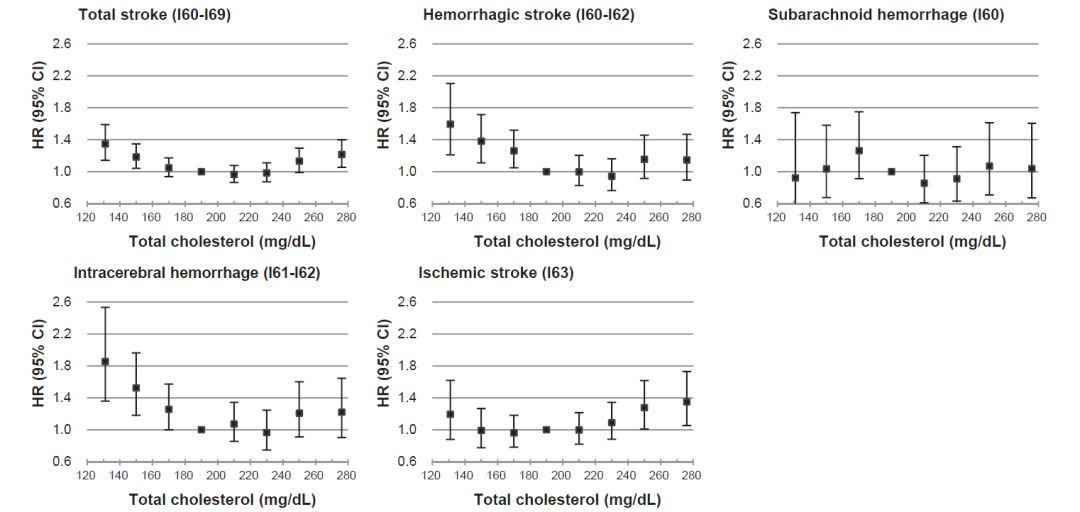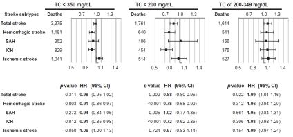 图2. 胆固醇与不同脑卒中亚型死亡率之间的HR值。