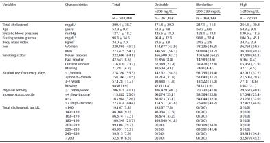 该研究共纳入韩国503340例40-80岁的中老年人;所有研究对象均在2002和2003进行健康检查,无心脏病或脑卒中史,随访至2013年。测量研究对象的总胆固醇(TC)和血糖,收集其年龄、性别、身高、体重、收缩压(SBP)、吸烟史、饮酒史、体力活动情况和家庭收入等信息(表1)。