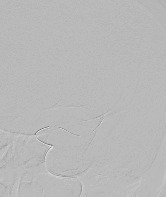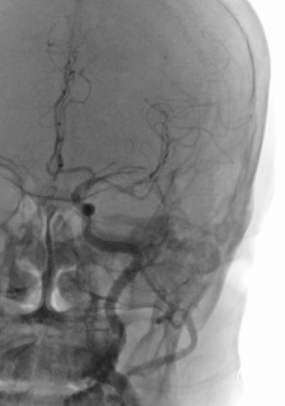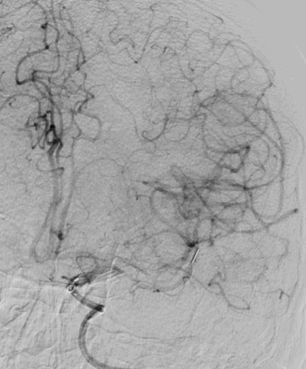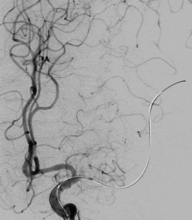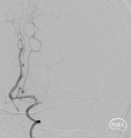 取栓后复查造影见左侧大脑中动脉仍闭塞。