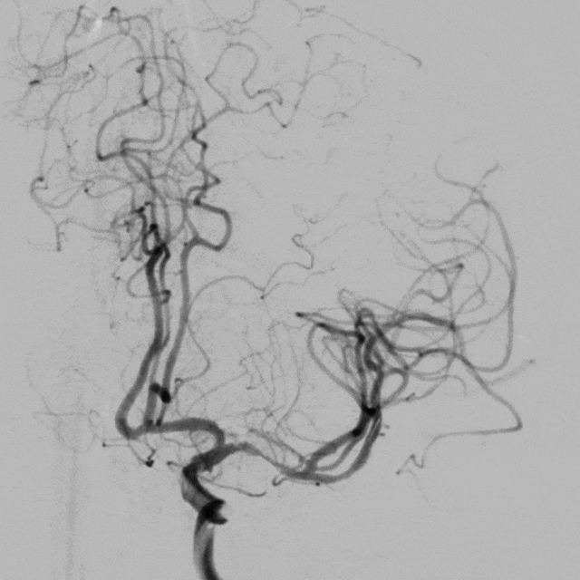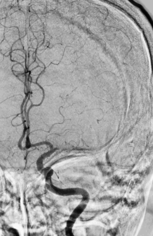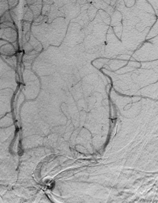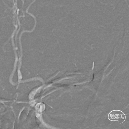 术前造影提示:左侧大脑中动脉闭塞,可见部分豆纹动脉显影,左侧大脑前动脉通过脑膜支代偿左侧大脑中上干。