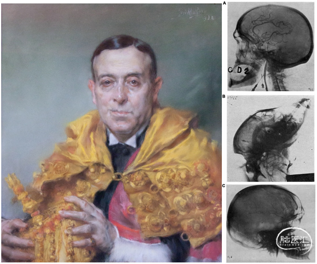 转机出现在1927年。葡萄牙神经学家埃加斯·莫尼兹(1874-1955)在狗的脑动脉造影实验取得初步成功后,便开启了人体研究及血管造影剂优化的征程。当完成世界上第一例脑血管造影检查后,莫尼兹激动地记录道:“我们第一次看到了人类大脑动脉的活体射线照片。在X光片上,我们可以看到肿瘤使大脑动脉发生了扭曲。”这一历史性的发现,让人类首次能够直观地观察到活体大脑动脉的真实形态。