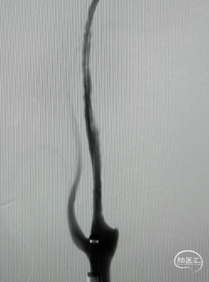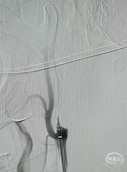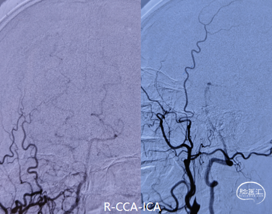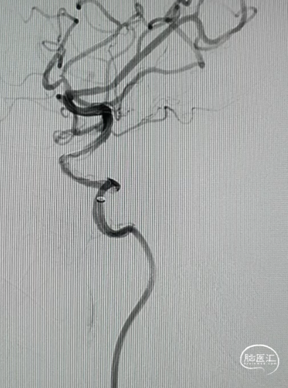 右侧颈内动脉起始段闭塞,动脉晚期可见颈动脉颅内段浅淡显影。