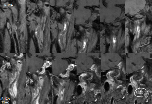 右侧颈内动脉全段管壁不均匀性增厚,腔内见多发混杂信号影,管腔显著狭窄、闭塞。增强扫描管壁不均匀强化,管腔内部分成分强化。