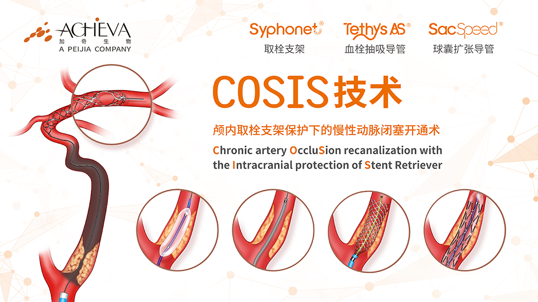 COSIS技术(Chronic artery OccluSion recanalization with the Intracranial protection of Stent retriever,颅内取栓支架保护下的慢性动脉闭塞开通术)是基于加奇生物 Syphonet®取栓支架的独特设计特点而衍生出的针对慢闭开通实施颅内保护的技术,在颅内动脉慢性闭塞,保护伞无法到位的情况下,利用Syphonet®取栓支架作为颅内保护装置,支架远端有网篮设计,可以捕获逃逸血栓而起到保护伞的作用。同时,Syphonet®取栓支架适配0.017、0.021inch的微导管,较小的微导管超选后,可直接将支架输送至远端释放,而减少了多次操作步骤。Syphonet®取栓支架推送导丝设计为0.0154inch,球囊可以通过该取栓支架的推送导丝直接到达狭窄或闭塞部位予以扩张。
