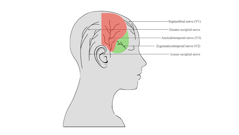 图1:本研究ATN患者疼痛部位的示意图。(绿色表示A型患者,疼痛位于前额前部的皮肤上;红色表示B型患者,疼痛位于发际线处或其后方的颞部。)