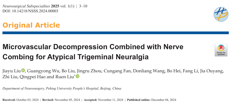 Liu J, Wu G, Liu B, Zhou J, Fan C, Wang D, et al. Microvascular Decompression Combined with Nerve Combing for Atypical Trigeminal Neuralgia. Neurosurgical Subspecialties. 2025;1(1):3-10. doi: 10.14218/NSSS.2024.00003.