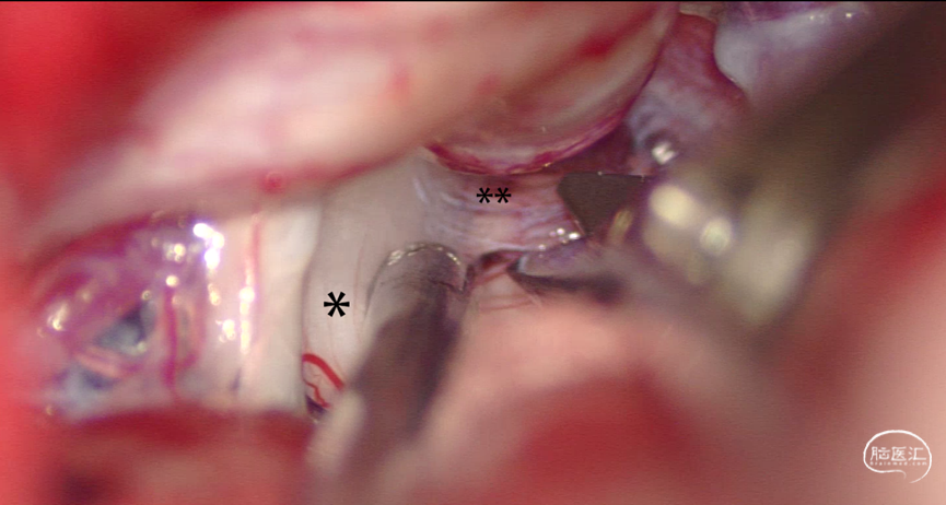 图2:在微血管减压术(MVD)中发现AA压迫了三叉神经。(*,三叉神经;**,蛛网膜)