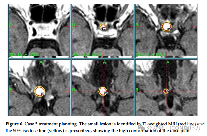 图6。病例5治疗方案。在T1加权MRI中发现小病变(红线),并按50%等剂量线(黄色)处方,显示剂量计划的高度一致性。