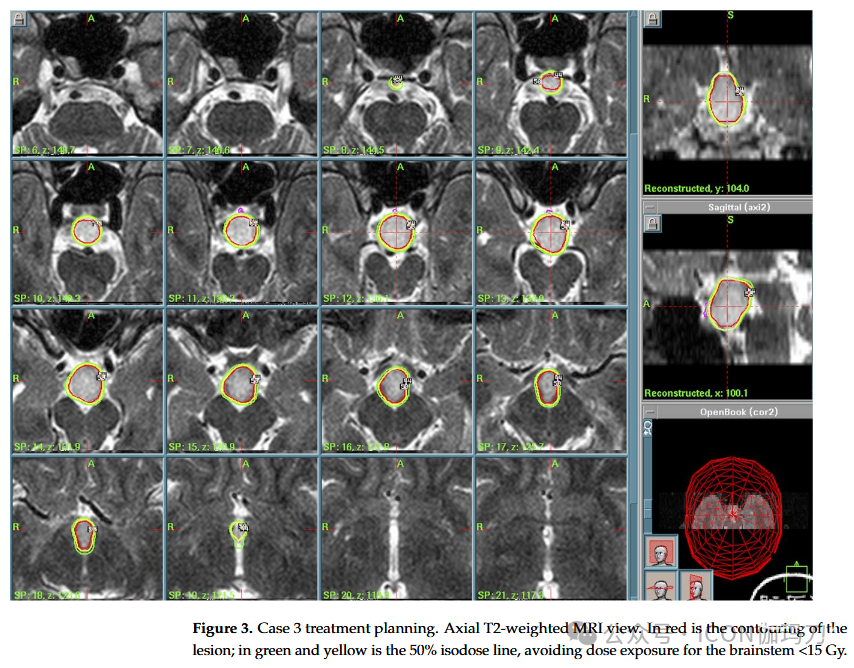 图3。病例3治疗方案。轴位T2加权MRI视图。红色是病变的轮廓;绿色和黄色为50%等剂量线,避免脑干<15 Gy的剂量暴露。