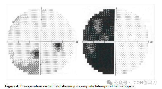 病例5:一名45岁的意大利女性于2006年1月因6个月的疲劳、多尿、烦渴、高泌乳素血症和闭经病史转介至我诊所,并接受抗利尿激素激动剂(去氨加压素)治疗。增强MRI(2005年7月)显示一个10毫米,界限清楚的鞍上病变。病变在T1加权钆显像上未见明显强化。在接下来的两个月里,患者开始主诉左侧颞叶偏盲,通过视野检查确诊(图4)。