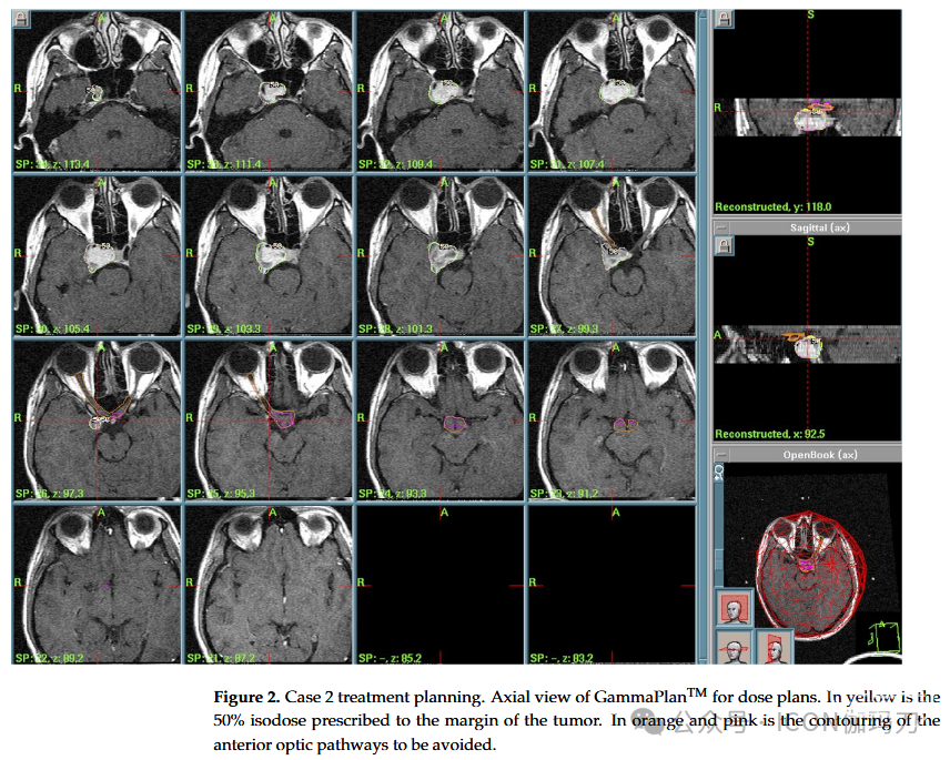病例2:24岁男性,复视病史6个月,既往诊断为下丘脑错构瘤,累及右侧海绵窦。在另一个中心进行显微手术(双额开颅)后,组织学上证实了诊断。临时诊断后,手术中断,建议放射外科治疗。考虑到具有挑战性的位置和并发症的风险,在多学科讨论后选择了辅助GKRS治疗。治疗参数(2005年)如下:PI为50%,PD为13.5 Gy, MD为27 Gy,总剂量为95.2 mJ, 12 Gy体积为7.13 cc(图2)。患者治疗当日出院,无新的神经功能障碍。经过5年良好的临床和放射影像学随访,患者失访(no longer contactable)。