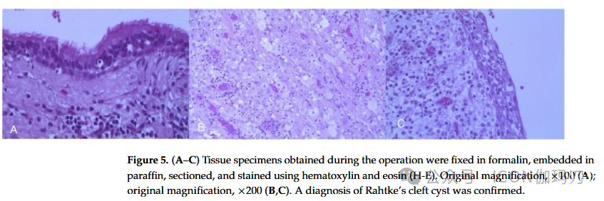 图5。(A-C)术中获得的组织标本用福尔马林固定,石蜡包埋,切片,苏木精和伊红染色(H-E)。原始放大倍数,×100 (A);原始放大倍数,×200 (B,C)。确诊为Rahtke裂隙囊肿。