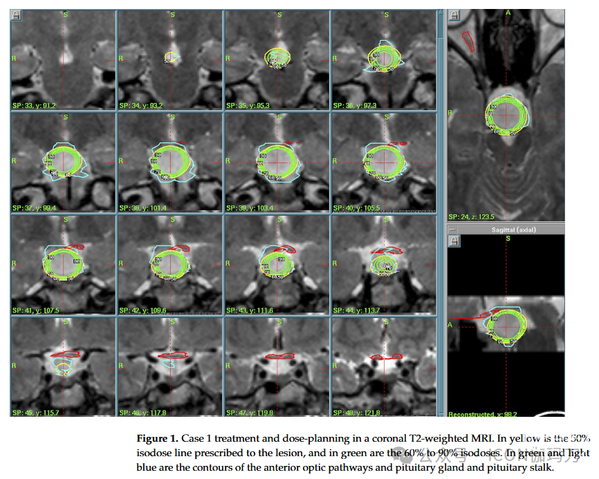 图1。病例1在冠状位T2加权MRI上的治疗和剂量计划。黄色为病变处方的50%等剂量线,绿色为60%至90%等剂量线。绿色和浅蓝色是前部视神经通路和垂体和垂体柄的轮廓。