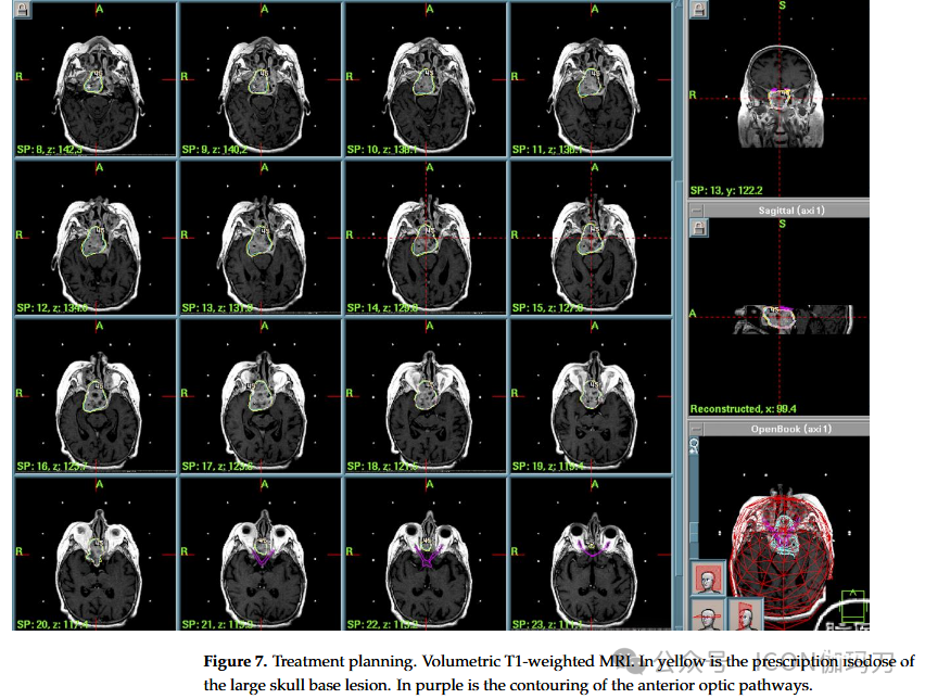 图7。治疗计划。体积T1加权MRI。黄色是大颅底病变的处方等剂量。紫色是前部视神经的轮廓。
