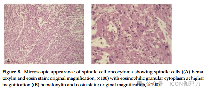 图8。梭形细胞嗜酸细胞瘤的显微镜外观显示梭形细胞((A)苏木精和伊红染色;原始放大倍数,×100),高倍倍率下的嗜酸性颗粒细胞质((B)苏木精和伊红染色;原始放大,×200)。
