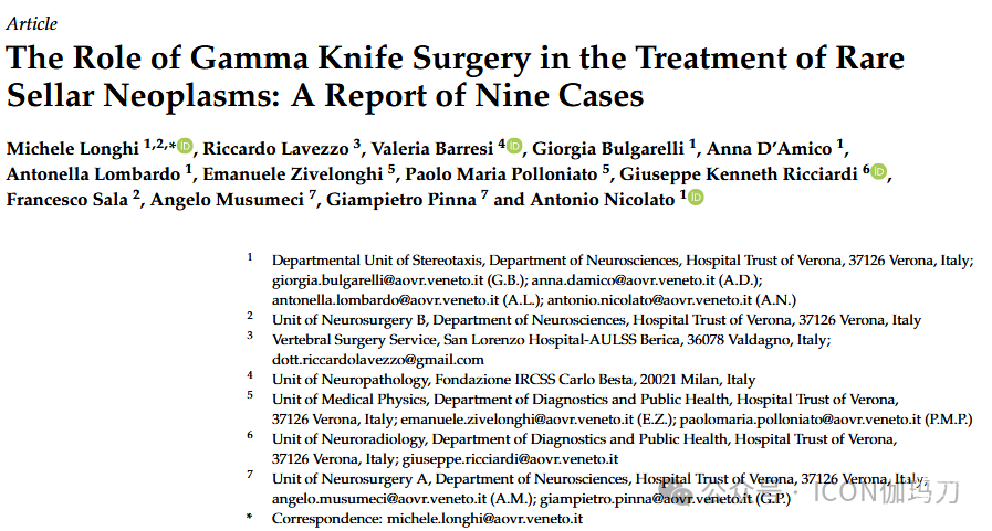 《Cancers (Basel)》2025年5月3日在线发表意大利Hospital Trust of Verona,的Michele Longhi , Riccardo Lavezzo , Valeria Barresi ,等撰写的《伽玛刀在治疗罕见鞍区肿瘤中的作用:附9例报告。The Role of Gamma Knife Surgery in the Treatment of Rare Sellar Neoplasms: A Report of Nine Cases》(doi: 10.3390/cancers17091564.)。