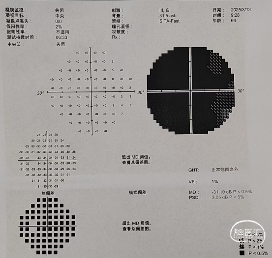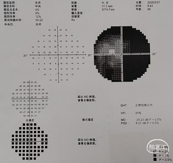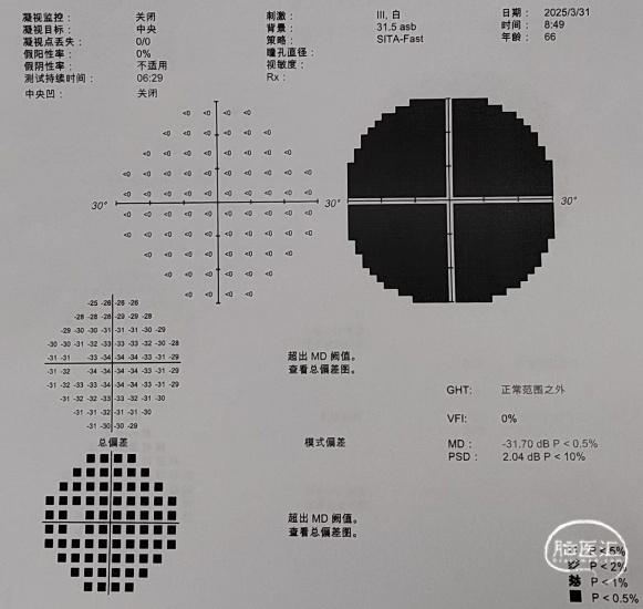 术后视力视野检查(2025年3月31日):左眼视力:指数/50cm,VFI:0%。右眼视力0.4,VFI:21%。