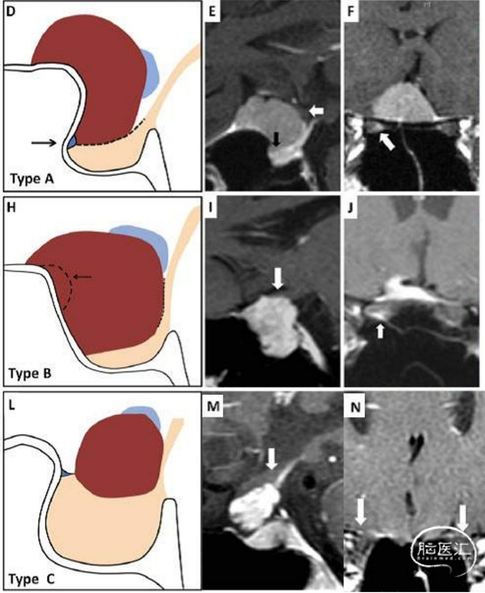 Type A:鞍结节脑膜瘤:肿瘤起源于鞍隔上,垂体柄前方,前海绵间窦通畅,鞍隔未累及。肿瘤将视交叉向后方或后上方推挤,部分肿瘤侵及视神经管。