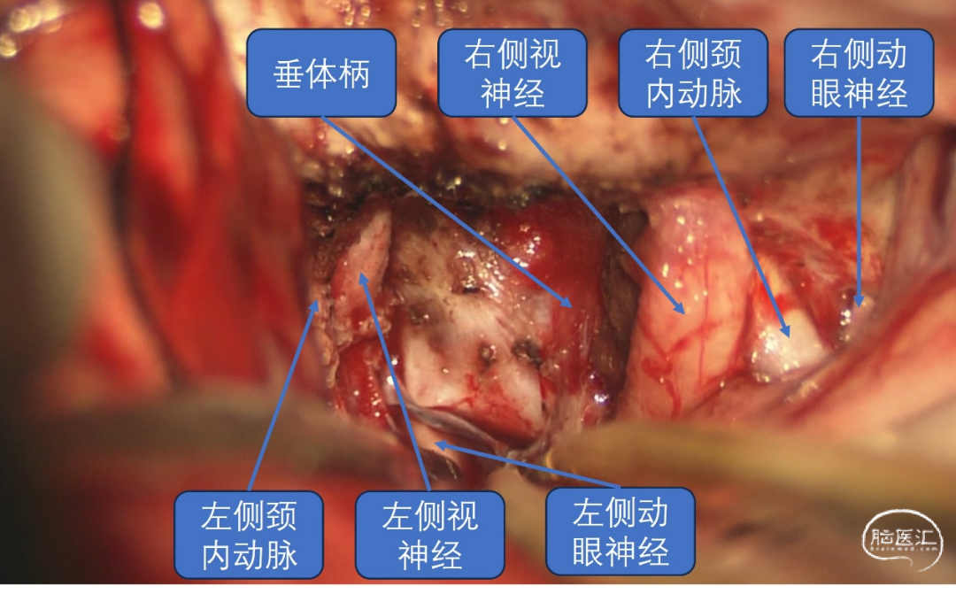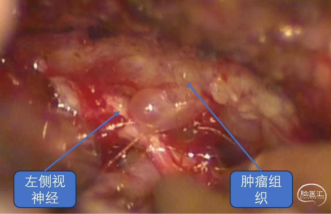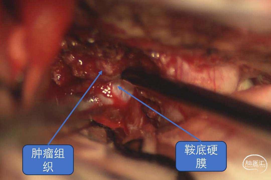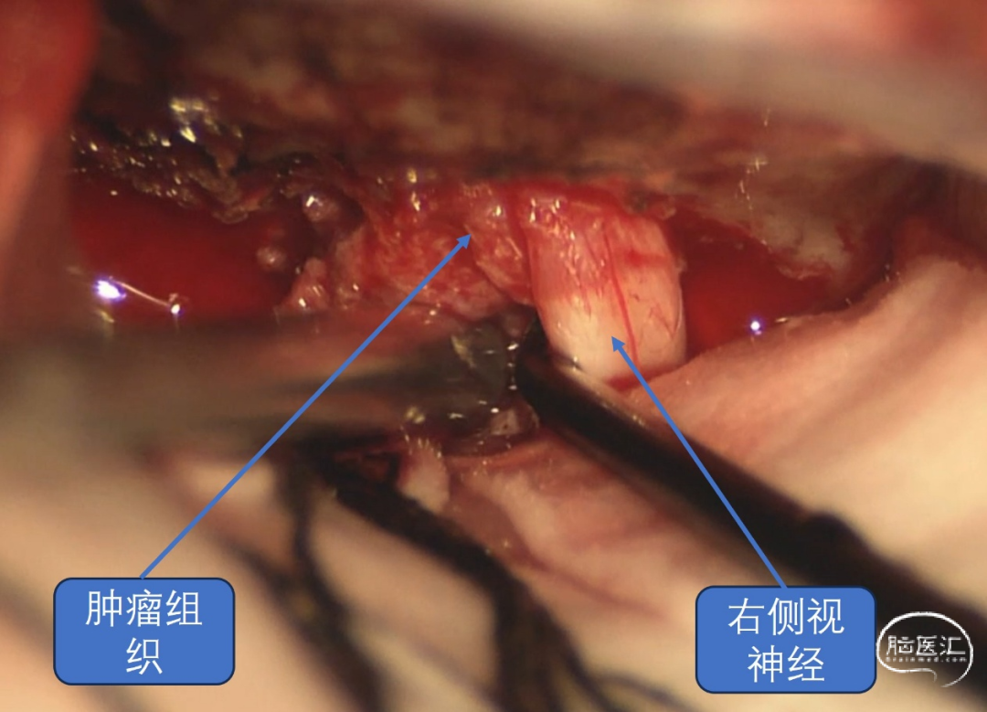 经详细术前评估及讨论后,予以全麻下行“右额外侧入路鞍区肿瘤切除术”,手术过程顺利,术中见肿瘤生长至双侧视神经管内,肿瘤包绕颈内动脉,同垂体柄粘连紧密。