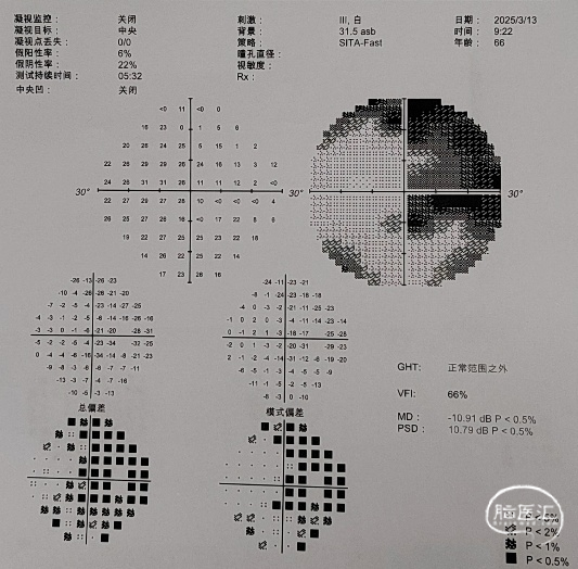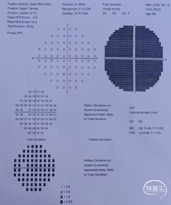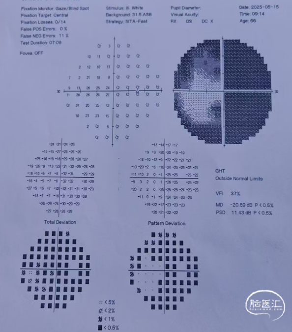 近期视力视野检查(2025年5月15日):左眼视力:指数/50cm,VFI:0%。右眼视力0.4,VFI:37%。患者双眼视力同前,右眼视野较前显著改善。