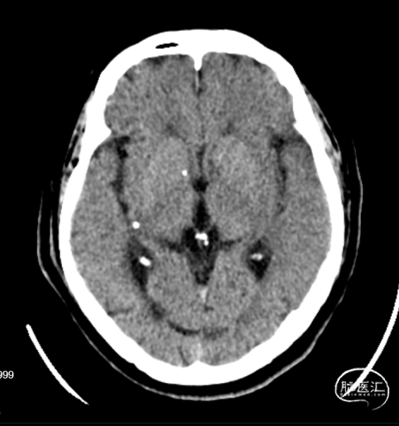 神经系统查体:浅昏迷,双侧额纹对称,双侧瞳孔等大等圆,直径3.0mm,对光反射灵敏,双眼左侧凝视,无震颤,右侧鼻唇沟变浅,口角左歪斜。右侧肢体肌力0级、肌张力减低,左侧肢体肌力5级、肌张力正常,右下肢病理征阳性,左下肢病理征阴性。颈软,无抵抗,布氏征、克氏征阴性。NIHSS评分22分。