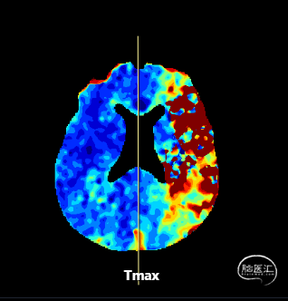 全脑核心梗死区(CBF<30%)体积为54.95mL,低灌注区(Tmax>6.0s)体积为183.95mL,Mismatch体积为129.00mL,Mismatch比值为3.35。
