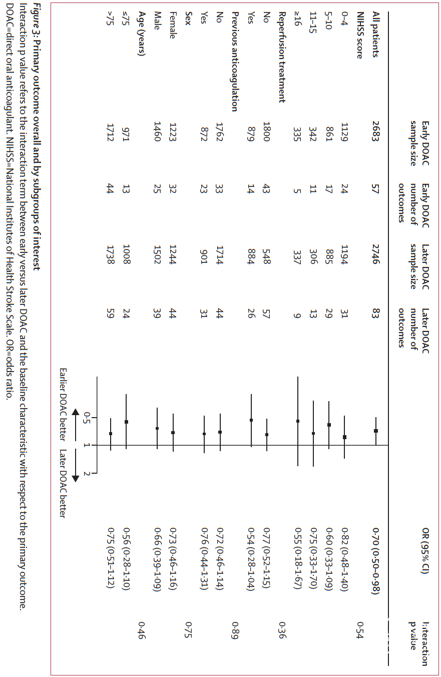 其他重要数据:早期DOAC vs 延迟DOAC,基线NIHSS评分11-15分 12.7% vs 11.1,NIHSS评分>=16分 12.6% vs 12.3%,取栓11.6% vs 12.1%,既往抗凝32.4% vs 32.9%,中位给药时间3.0天(IQR 2.1-3.7)vs 7.2天(IQR 5.8-8.4);ELAN试验 379例 vs 375例(译者注:该研究共2013例患者,该meta分析仅纳入其中的754例,是因为该meta分析仅纳入了ELAN中型卒中患者),OPTIMAS试验 1814例 vs 1807例(译者注:该研究共纳入了3648例),START试验 49例 vs 131例(译者注:该meta分析仅纳入了START的轻-中度卒中),TIMING试验 449例 vs 437例。90天主要复合结局 3.1% vs 3.51%(P=0.40)