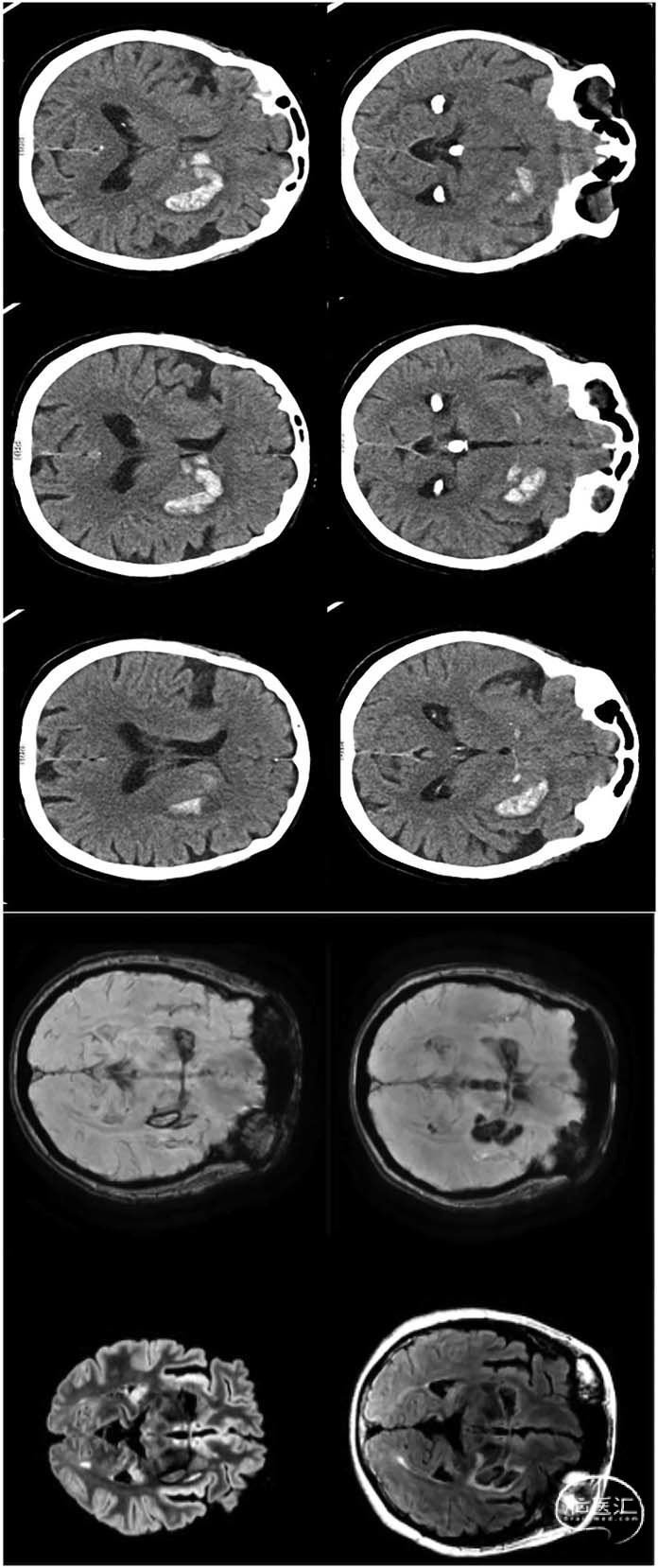 图.入院时颅脑CT轴位图像与3个月后随访MRI(含T2-FLAIR及磁敏感加权血管成像序列)。影像显示左侧基底节区深部脑出血,经Gratiolet管跨胼胝体延伸至对侧基底节区: