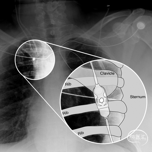 图2.术后分流系统定位胸片正位像,显示分流阀置于锁骨尾侧。示意图放大并标注了解剖结构,明确分流阀相对于锁骨的位置关系: