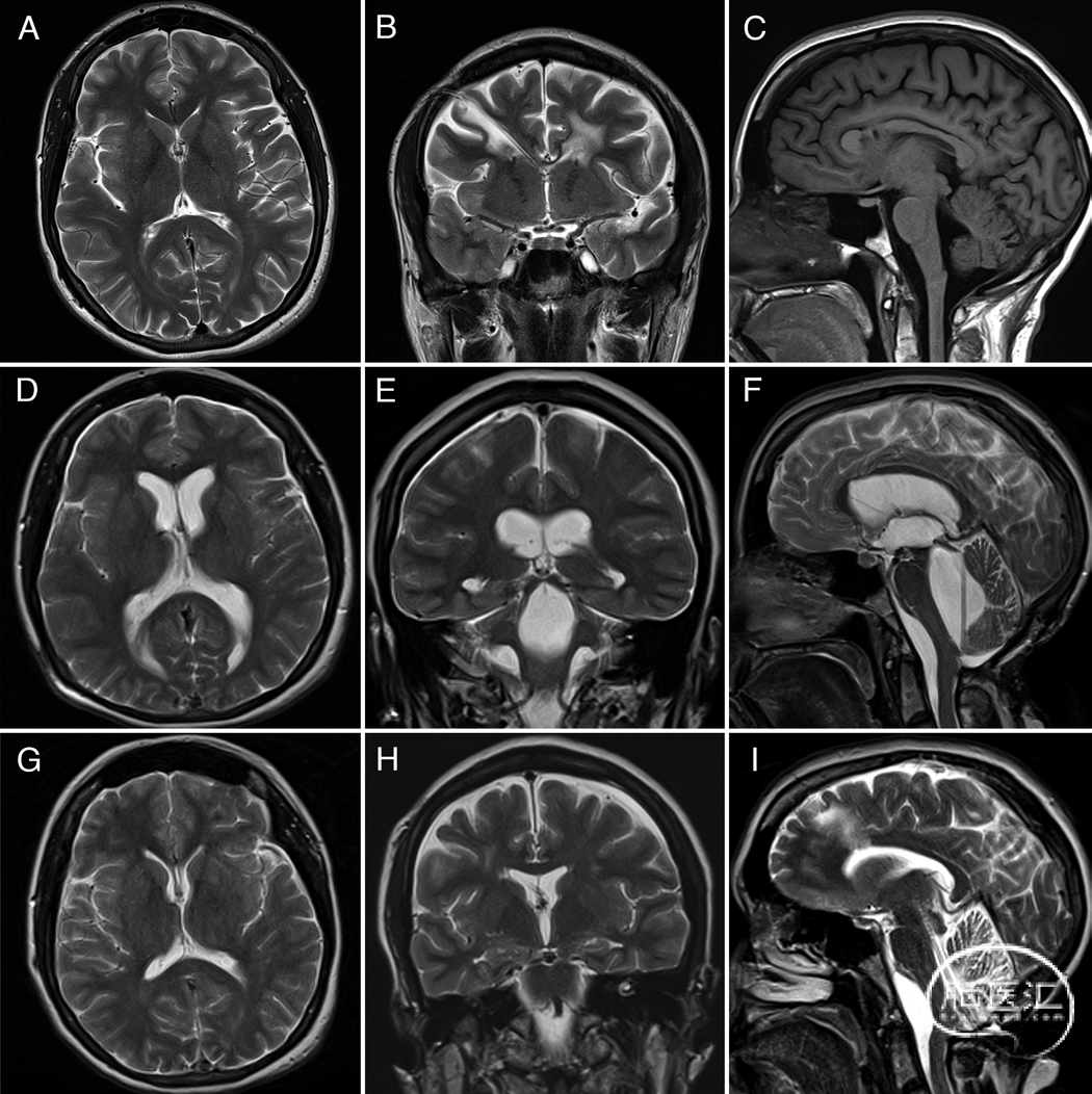 图1. 病例1。T2加权(A、B及D–I)与T1加权(C)磁共振图像显示脑室扩大进展。A–C:分别为轴位、冠状位及矢状位图像,呈现神经功能正常状态下的基线脑室系统形态。D–F:分别为轴位、冠状位及矢状位图像,显示治疗前脑室系统显著进行性扩大,以第四脑室扩大最为明显。G–I:分别为轴位、冠状位及矢状位图像,展示治疗后1年脑室扩大程度改善,神经系统症状完全缓解: