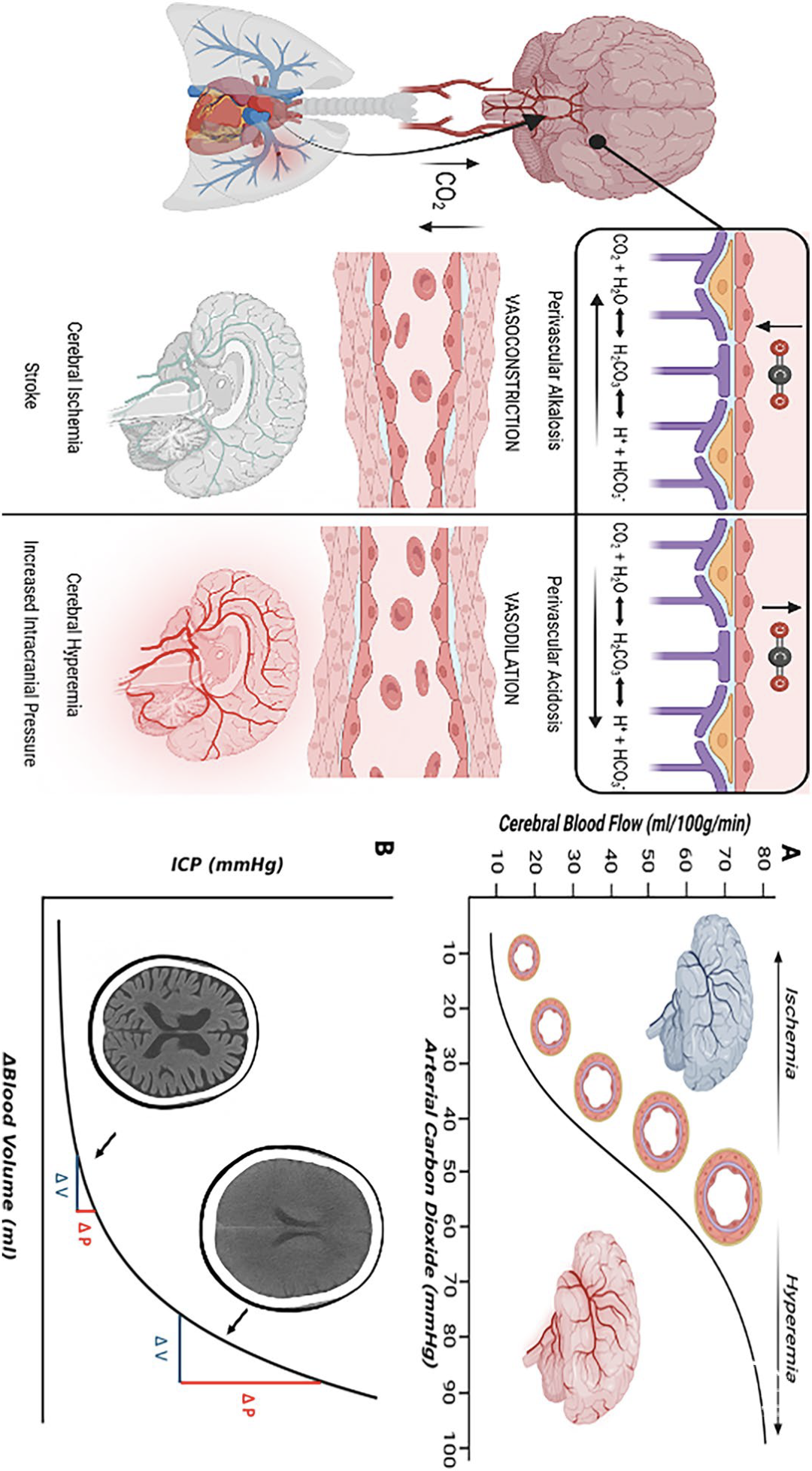 图1 二氧化碳对脑血流量(CBF)和颅内压(ICP)的影响。本图阐释了血管收缩与舒张的相关风险,以及二氧化碳与大脑反应性的基本病理生理机制。A PaCO₂与CBF在20-80 mmHg范围内呈近似线性关系。在此区间内,PaCO₂升高会导致血管周酸中毒、脑小动脉扩张及CBF增加;而PaCO₂降低则引起血管周碱中毒、脑小动脉收缩及CBF减少。该关系的临床意义在于:较低PaCO₂水平可能引发脑缺血,较高水平则可能导致充血(伴潜在ICP升高)。B 脑血容量变化与ICP的关系取决于基础脑弹性。在脑弹性较低的患者中,特定幅度的PaCO₂升高所致血容量增加仅会引起轻微且临床意义不显著的ICP升高;反之,在脑弹性增高的患者中,同等程度的PaCO₂和血容量增加可能导致显著且具有潜在危险性的ICP上升。缩写:CBF脑血流量,ICP颅内压,PaCO₂动脉血二氧化碳分压: