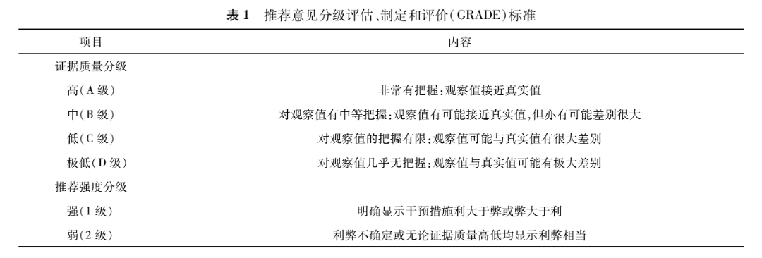 编委会根据职责分为共识指导组、证据评价与撰写组、专家共识组和外审组。其中,共识指导组由1名学术顾问、2名专家组长和1名方法学家组成,其主要职责为监督指导共识制订过程和审定共识全文;方法学专家全程参与指导证据的检索、评价及分级。证据评价与撰写组由发起人单位的多名资深临床专家组成,主要职责为共识注册和撰写计划书、提出具体临床问题,对确定的临床问题进行证据检索、评价及分级,执笔撰写和修改推荐意见。证据评价与撰写组系统检索了PubMed、EMBASE、Cochrane Library、中国知网、万方数据知识服务平台等从建库起至2024年10月发表的文献,英文检索词为“spinal dural arteriovenous fistula““spinal arteriovenous fistula”“spinal arteriovenous malformation”等,中文检索词为“硬脊膜动静脉痿”等,涵盖的文献类型包括荟萃分析、原始临床研究、综述以及个案报道等。采用推荐意见分级评估、制定和评价(Grading of Recommendations Assessment,Development and Evaluation,GRADE)标准对证据和推荐意见进行分级(表1)。对部分无直接证据支持的临床问题,依据专家的临床经验,形成基于专家共识的推荐意见。专家共识组由本领域全国知名的专家组成,其主要职责是对提出的临床问题及初拟的推荐意见进行多次的讨论修订。编委会组织专家共识组成员于2024年8月14日启动推荐意见调查反馈,于2024 年12月9日邀请22名专家参与线上和线下讨论会,根据讨论意见进一步修改,所有推荐意见均达成共识(每条推荐意见共识率>85%)。外审组由3名本领域经验丰富但参与共识制订的专家组成,其主要职责为评审共识最终版,对共识存在的重大风险或问题,以及具体的推荐意见内容提出建议。所有编委会成员均填写了利益声明表,所有成员均不存在与本共识直接的利益冲突,且参与了共识制订的全过程。