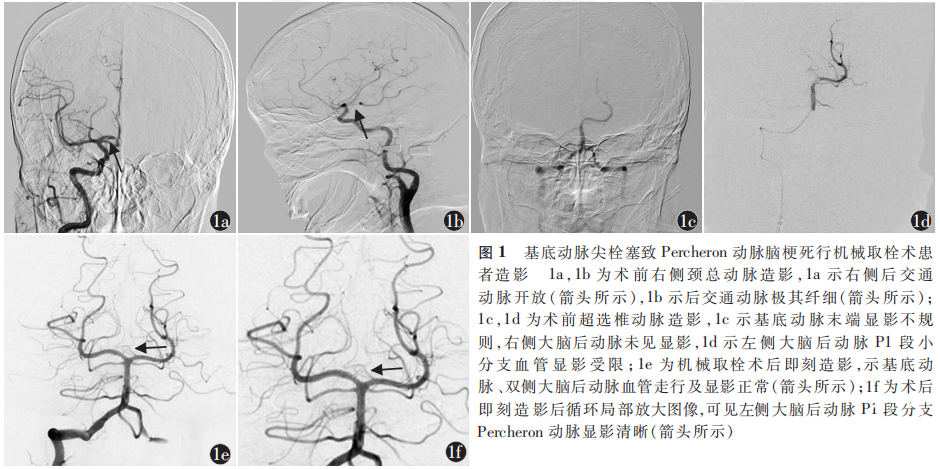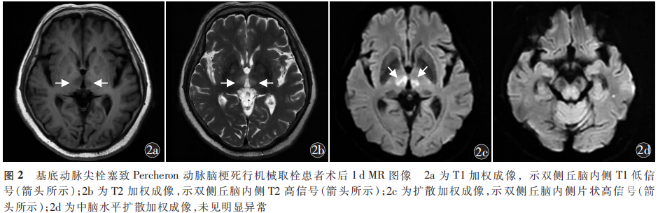 初步诊断为急性心源性脑栓塞,为进一步明确诊断于14:20局部麻醉下行头部DSA,右侧颈总动脉造影示右侧后交通动脉开放(图1a),右侧大脑后动脉正常显影,后交通动脉极其纤细(图1b);超选椎动脉造影示基底动脉末端显影不规则,右侧大脑后动脉未见显影(图1c),左侧大脑后动脉起始处管腔显影欠规则,P1段小分支血管显影淡(图1d),考虑基底动脉尖端急性栓塞可能,遂全身麻醉下行机械取栓术。将颈动脉导引鞘(RSC05;泰尔茂,日本)置于右侧锁骨下动脉,使用可控导丝(M001508100;波科国际,美国)沿颈动脉导引鞘将血管内通路导管(ERAC-065-127;威海禾木)置于基底动脉尖端,负压抽吸的同时回撤血管内通路导管,抽吸出大量栓子,造影示基底动脉、双侧大脑后动脉显影清晰(图1e),术后(15:30)造影示改良脑梗死溶栓(modified thrombolysis in cerebral infarction,mTICI)分级3级,可见左侧大脑后动脉P1段分支显影清晰,考虑为AOP(图1f)。后颅内给予盐酸替罗非班氯化钠注射液(西安万隆)5ml缓慢推入,20min后再次造影示mTICI分级3级,将余95ml盐酸替罗非班氯化钠注射液24h内持续静脉泵入以维持血管通畅。患者术后2h出现血压低、心动过缓,给予盐酸多巴胺(2ml/20mg;共计600mg)持续静脉泵入2d,症状好转后停用。术后1d行头部MR检查,示双侧丘脑内侧T1低信号(图2a)、T2高信号(图2b),扩散加权成像(DWI)示双侧丘脑内侧片状高信号(图2c),提示AOP脑梗死;DWI示中脑水平未见明显异常(图2d)。住院期间系统给予丁苯酞氯化钠注射液(100ml/次,1次/12h,静脉滴注)改善神经功能缺损,疏血通注射液(6ml/次,1次/d,静脉滴注)改善循环,阿托伐他汀钙片(20mg/次,1次/晚,口服)降脂稳定斑块、达比加群酯胶囊(110mg/次,2次/d,口服)抗凝等治疗。术后第1天患者仍嗜睡,言语不清程度较前好转,对日常简单问题回答正确,遵嘱可行简单指令,NIHSS评分4分,mRS评分4分,GCS评分14分(睁眼反应3分,言语反应5分,运动反应6分)。术后第3天患者意识清楚,言语清晰,对答反应基本正常,不能自行行走,NIHSS评分0分,mRS评分4分,GCS评分15分(睁眼反应4分,言语反应5分,运动反应6分)。2024年1月24日出院时行走需1人稍搀扶,mRS评分4分。出院后3个月电话随访,患者经积极康复训炼后可自行行走,生活自理,mRS评分1分。出院后6个月门诊随访,恢复至发病前状态,mRS评分0分。