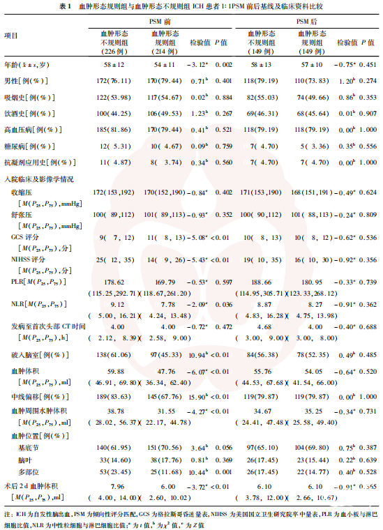 PSM前血肿形态规则组和血肿形态不规则组患者基线及临床资料比较中年龄、术后2d血肿体积及入院GCS评分、NIHSS评分、NLR、血肿破入脑室患者比例、术前血肿体积、术前血肿周围水肿体积、血肿位于多部位、中线偏移患者比例差异均有统计学意义(均P<0.05)。见表1。将上述因素进行1∶1 PSM后298例ICH患者被纳入统计学分析,其中男228例,女70例,年龄20~84岁,平均(57±12)岁。PSM后血肿形态不规则组和血肿形态规则组患者基线及临床资料比较差异均无统计学意义(均P>0.05)。见表1。