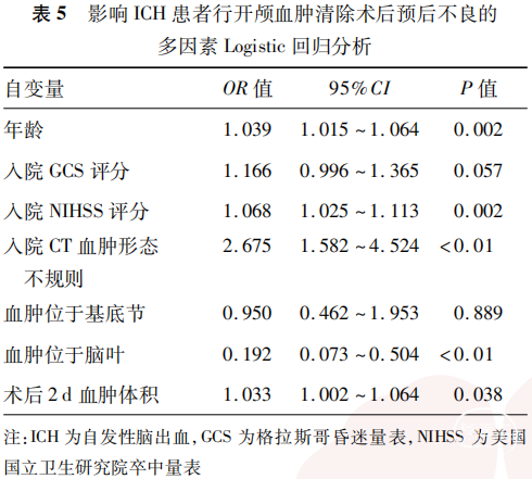 以预后不良为因变量,将预后良好和预后不良患者组间比较中P<0.05的因素作为自变量,进行多因素Logistic回归分析,结果显示,高龄(OR=1.039,95% CI:1.015~1.064,P=0.002)、高入院NIHSS评分(OR=1.068,95% CI: 1.025~1.113,P=0.002)、入院CT血肿形态不规则(OR=2.675,95% CI:1.582 ~ 4.524,P<0.01)、术后2d血肿体积大(OR=1.033,95% CI:1.002~1.064, P=0.038)是ICH患者行开颅血肿清除术后预后不良的独立危险因素,血肿位于脑叶(OR=0.192,95% CI:0.073~0.504, P<0.01)是ICH患者行开颅血肿清除术后预后不良的保护因素。见表5。