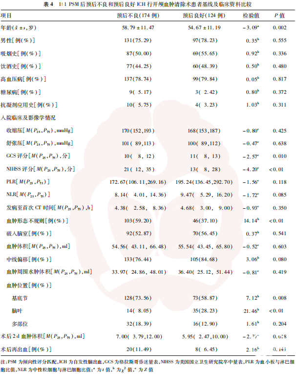 1∶1 PSM后预后不良患者174例(58.4%),预后良好患者124例(41.6%),两组年龄、术后2d血肿体积及入院GCS评分、入院NIHSS评分、入院CT血肿形态不规则、血肿位于基底节及脑叶患者比例差异均有统计学意义(均P<0.05),余基线及临床资料差异均无统计学意义(均P>0.05)。见表4。